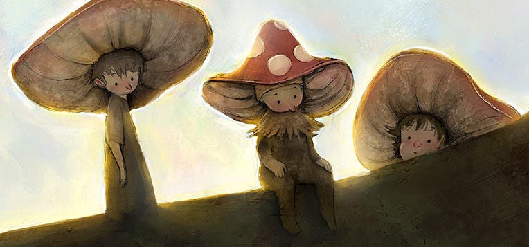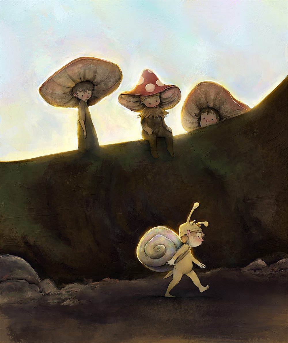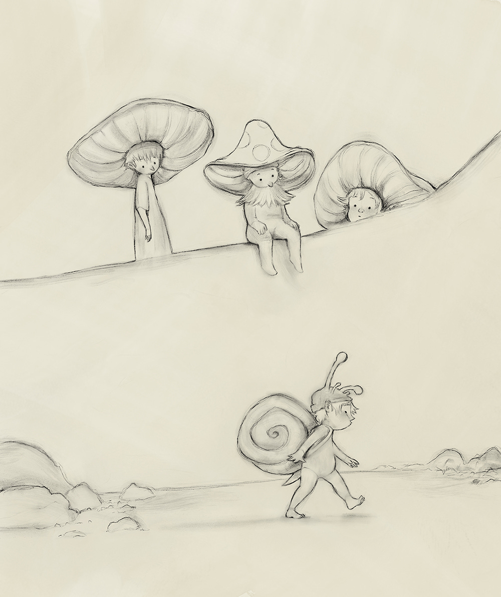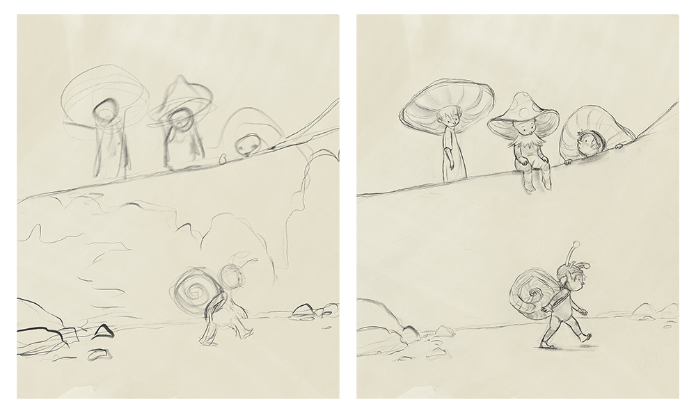I like muted colours. I tend to gravitate towards browns, greens, yellows and red accents. Because I know what I like, I didn’t plan the colour palette beforehand; I just followed my instincts. I knew I wanted the snail fellow to pop against a dark background, and the silhouettes of the mushroom fellows to read starkly against the bright sky. Other than that, I made it up as I went. At some point in the process, I decided to add some opalescence to the sky and snail shell. I think it works! A sneaky way of getting colour in there without impacting the overall brown. I should say that for client work, I would put considerably more thought into colour, and would likely be working from a pre-planned palette.