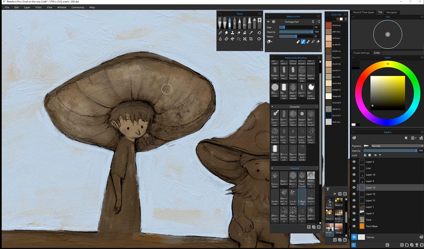 For a very long time I only painted in Photoshop. I knew the application well, I liked the brushes - it was a comfort zone. Then (a few years ago now) I finally got myself an iPad, and I completely fell in love with Procreate. The brushes didn’t quite behave the way I wanted them too, but the app more than made up for that by how truly pleasurable it was to draw in. I now frequently finish entire projects in Procreate, including whole picture books for publishers. But I recently started experimenting with a painting program called Rebelle, by Escape Motions.