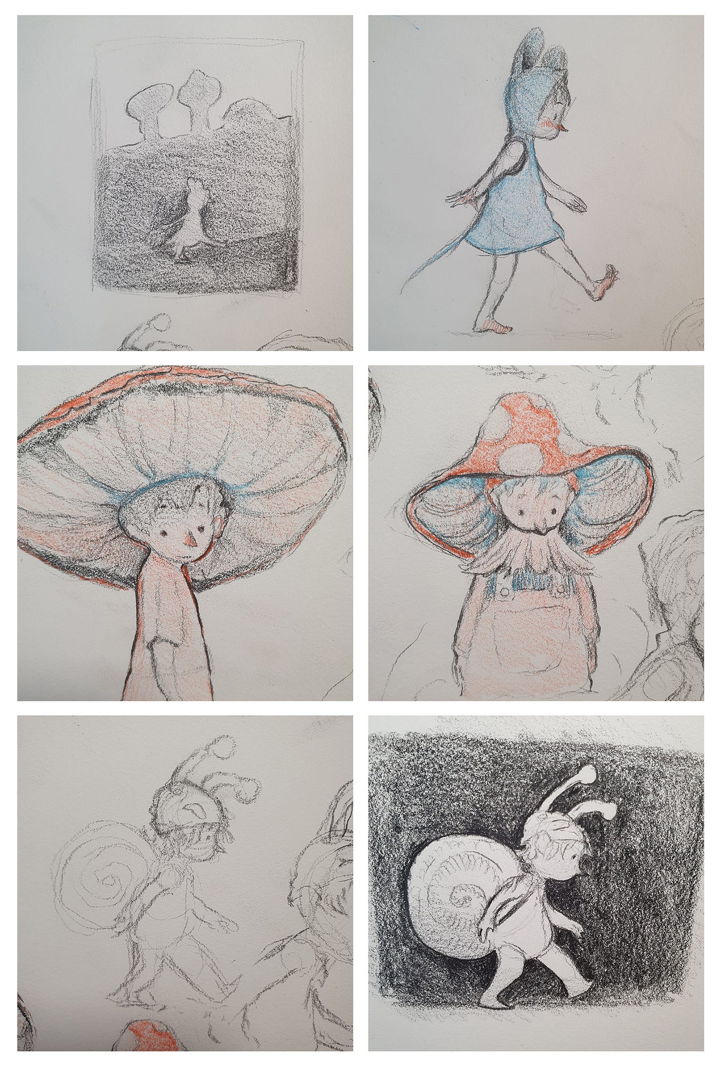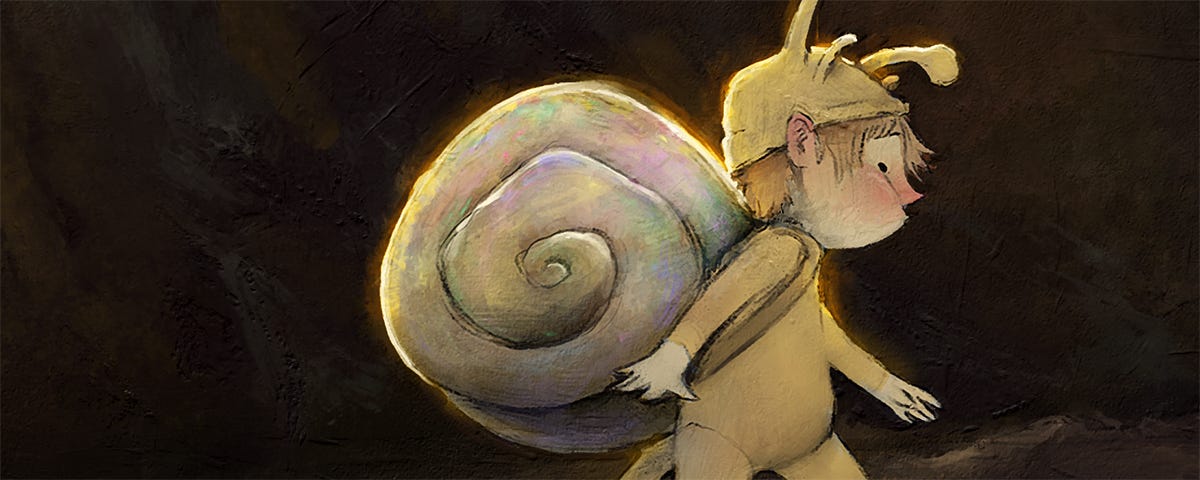 Once I have the references I need, I start sketching. Most of the time I’ll jump straight into Procreate for this. But sometimes I like to start on paper. Working on paper forces you push past your mistakes and keep moving, rather than standing still to endlessly erase and revise. I end up with a lot of garbage but it’s good garbage - I like seeing my mistakes and how I tweak ideas along the way. Initially, I planned for the main character of this piece to be a child dressed as a mouse. But I changed my mind along the way and made them a snail instead. This stage is basically about thinking it through, and seeing quickly what might or might not work.